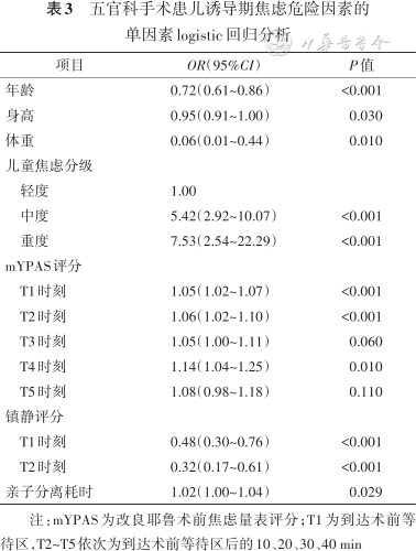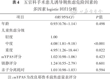 五官科手术患儿诱导期焦虑危险因素的多因素logistic回归分析