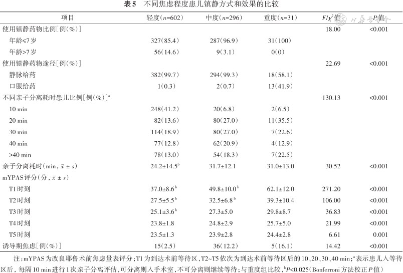 3组患儿年龄、镇静用药途径、亲子分离耗时和诱导期焦虑比例差异均有统计学意义(均P<0.001)。T1~T5时刻,3组患儿mYPAS评分差异均有统计学意义(P<0.001或P=0.001);两两比较结果显示,T1和T2时刻轻度组和中度组患儿的mYPAS评分均低于重度组,而在T3时刻,仅轻度组患儿的mYPAS评分低于重度组,结果详见表5。