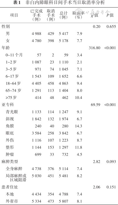 非白内障眼科日间手术当日取消率为7.8%,其中高龄患者、创伤较小的眼科手术当日取消率较高。患者当日未出现及患者病情变化是当日取消手术的主要原因,且多数是可避免的。
