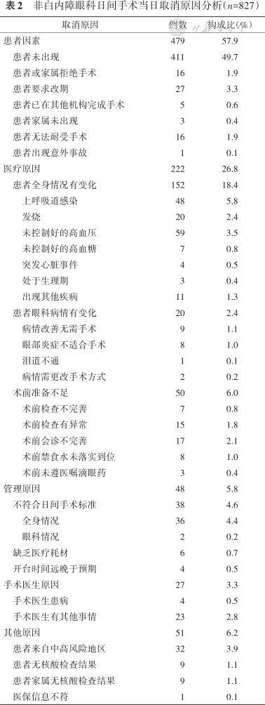 非白内障眼科日间手术当日取消原因分析(n=827)