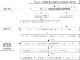 H. pylori首诊个性化诊疗的理念逐渐被国际主流接受和认可。在2017年的国际Maastricht V共识中提到,当一线治疗中考虑使用克拉霉素方案时推荐行克拉霉素药敏试验,除非已有充分证据显示该地区人群中克拉霉素耐药率<15%,克拉霉素药敏试验可采用标准培养的方法,也可采用分子生物学方法直接对胃黏膜活检标本进行检测[10]。2020年台北全球共识建议的H. pylori诊疗流程为:若药敏试验可行,则推荐做药敏试验。若不可行,则推荐给予当地证实有效的方案[11]。2020年H. pylori韩国循证医学指南将治疗前行聚合酶链反应(polymerase chain reaction,PCR)或测序法的克拉霉素耐药试验列入了一线推荐[12]。世界胃肠病学组织在2021年更新的H. pylori诊疗指南中指出[13]:根除成功的主要决定因素是在治疗前了解抗生素耐药性。使用PPI-阿莫西林-克拉霉素方案根除成功的主要决定因素是治疗前克拉霉素是否耐药。PCR检测能够以较高的灵敏度和特异性检测H. pylori,也能检测导致克拉霉素耐药的突变,有望成为H. pylori感染管理方面的一个重大进展。在耐药性高的地区提供这种检测可能会大大有助于为个体患者选择治疗方法,同时也有利于调查人群中的流行情况[13]。从近年的国际共识/指南可见,基于耐药检测尤其是基于PCR等分子生物学方法的耐药检测的个体化治疗越来越受到认可和重视。