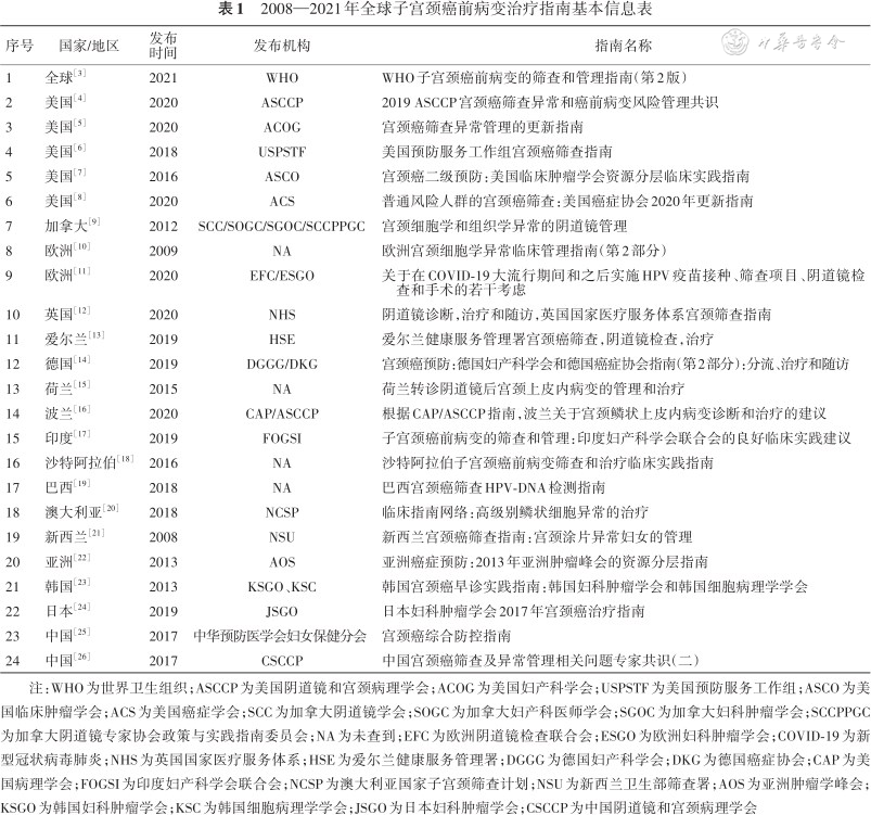 2008—2021年全球子宫颈癌前病变治疗指南基本信息表