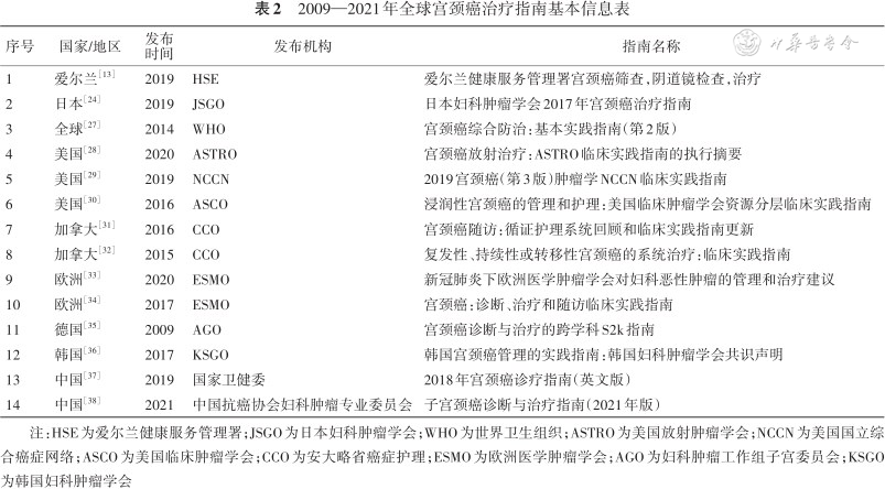 2009—2021年全球宫颈癌治疗指南基本信息表