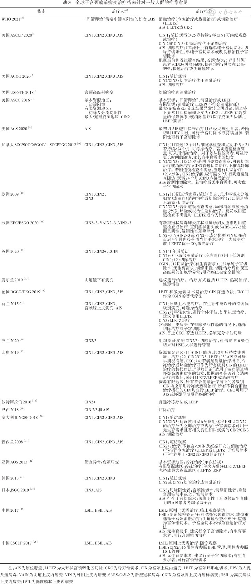 1.治疗推荐:大多数指南对宫颈上皮内瘤变1级(cervical intraepithelial neoplasia,CIN1)人群建议首选随诊观察,除欧洲[10]指南推荐阴道镜检查不满意可进行切除治疗。美国阴道镜和宫颈病理学会(American Society for Colposcopy and Cervical Pathology,ASCCP)[4]、加拿大[9]、印度[17]指南推荐连续观察2年持续CIN1,可进行治疗。大多数指南对30~65岁女性子宫颈癌前病变治疗的阈值是CIN2。波兰[16]、澳大利亚[20]、中国阴道镜和宫颈病理学会(Chinese Society for Colposcopy and Cervical Pathology,CSCCP)[26]指南中CIN2/p16阳性参照高级别宫颈上皮内瘤变(high-grade squamous intraepithelial lesion,HSIL)管理。而对于CIN2/p16阴性者,原则上无需治疗,随访观察,必要时行诊断性锥切术。对阴道镜检查满意的CIN2或CIN3,大多数指南推荐切除治疗或消融治疗;不满意者建议进行切除治疗。其中美国ASCCP[4],美国妇产科学会(American College of Obstetricians and Gynecologists,ACOG)[5]明确指出切除治疗优于消融治疗。WHO[39]、美国临床肿瘤学会(American Society of Clinical Oncology,ASCO)[7]、印度[17]、亚洲肿瘤学峰会(Asian Oncology Summit,AOS)[22]指南中提出组织学证实CIN2~3或“即筛即治”策略中筛查阳性的妇女若符合指征可采用冷冻治疗或热凝治疗。对原位腺癌(adenocarcinoma in situ,AIS),无论阴道镜检查是否满意推荐切除治疗。详见表3。