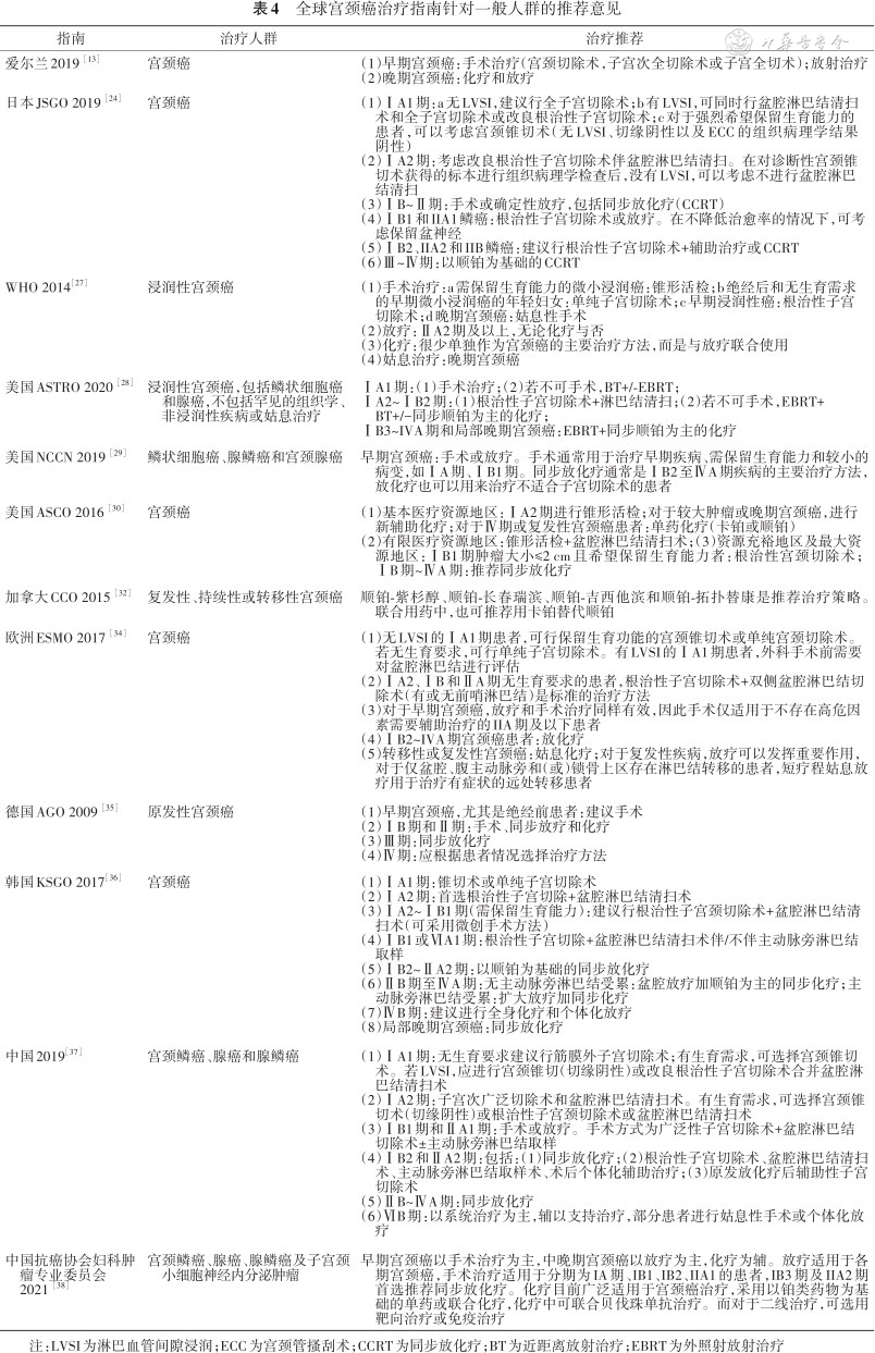 系统梳理与总结全球子宫颈癌前病变及宫颈癌治疗指南的制订现状和推荐意见。