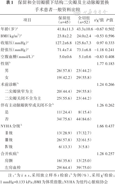 45例保留组与52例全切组患者的年龄分别为(41.8±11.3)和(43.3±10.6)岁(P=0.502),2组患者性别、体质指数(body mass index,BMI)、血压、血糖水平、术前主要诊断、主动脉瓣狭窄情况、美国纽约心脏病学会(New York Heart Associatio,NYHA)心力衰竭程度分级、合并疾病情况差异均无统计学意义(均P>0.05),具有可比性,详见表1。