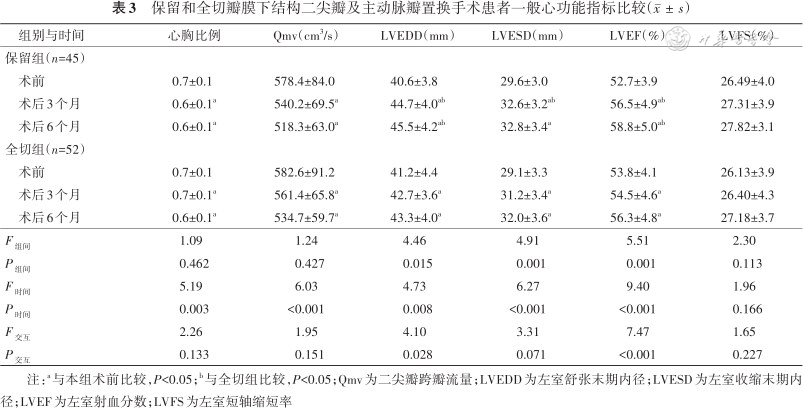 Qmv、LVEDD、LVEF均存在组间×时间的交互效应(均P<0.05)。术前,保留组和全切组患者的心胸比例、Qmv、LVEDD、LVESD、LVEF、LVFS差异均无统计学意义。保留组患者术后3和6个月的LVEDD、LVEF均大于全切组,保留组术后3个月的LVESD大于全切组,差异均有统计学意义。详见表3。
