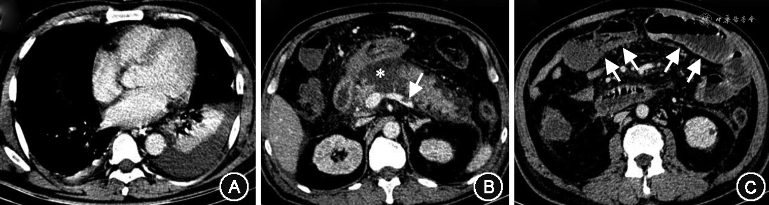 AP病因分类标准参照相关指南[7, 8];RAC标准下的AP严重度分级,是在具有自动评分和自动诊断功能的AP数据库根据收集的资料自动判定为MAP、MSAP和SAP[6]。胰腺的形态改变、局部并发症和胰腺外并发症由两名具有10年工作经验以上的影像科医师在不知临床资料的情况下分别评估,评估结果不一致经协商判定;评估结果录入AP数据库后由系统自动计算CTSI和MCTSI评分(表1)。根据CTSI得分将AP严重程度分3级[6]:MAP 0~3分;MSAP 4~6分;SAP 7~10分。同样以MCTSI得分评估AP严重程度[6]:MAP 0~2分;MSAP 4~6分;SAP 8~10分(图1)。坏死性胰腺炎的诊断标准:CT增强检查胰腺内出现无强化区域和(或)胰周积液密度混杂、见脂肪碎片(脂泡影)[9]。IPN的诊断标准[5]:CT显示胰腺和(或)胰周坏死组织内出现气体;或胰腺坏死细针抽吸行细菌涂片或培养检出细菌或真菌。器官衰竭和持续性器官衰竭的诊断采用改良的Marshall标准[5]。纳入的AP患者均参考国内外指南及共识给予规范的综合治疗[5,7, 8,10],治疗原则包括早期液体复苏和镇痛;器官衰竭者给予重症监护和器官支持治疗;MAP经口进食低脂食物,不能耐受经口饮食的MSAP及SAP给予肠内营养;腹胀者应采取胃肠减压,口服生大黄或乳果糖口服液促进排便;病情稳定的IPN患者给予抗生素抗感染,治疗1周无效,给予升阶梯微创治疗,微创治疗病情无改善者考虑手术。