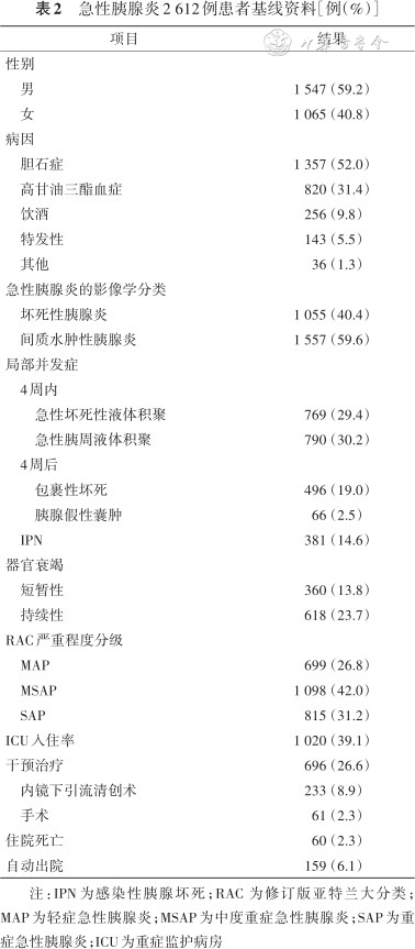 急性胰腺炎2 612例患者基线资料[例(%)]