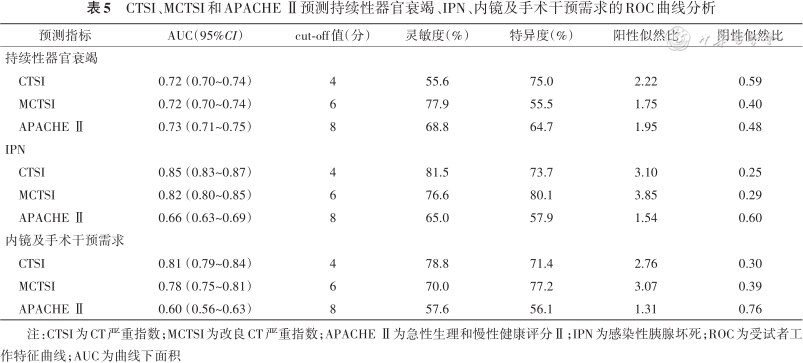 总之,CTSI对AP严重程度的判定与RAC存在差异,而MCTSI与RAC对AP严重程度的判定较一致。CTSI和MCTSI评分系统均具有评估临床预后的价值,其中CTSI预测IPN及内镜和手术需求的准确性最高,但预测持续性器官衰竭准确性稍低于APACHE Ⅱ评分。
