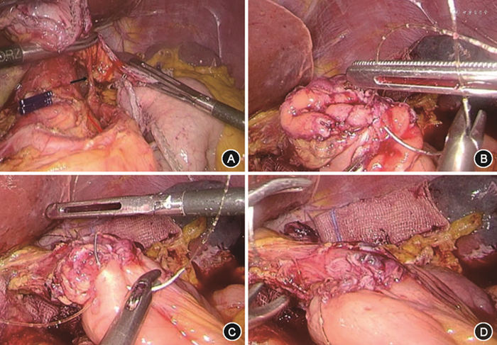 4. 手术方法:由同一组医师完成全腹腔镜下保留贲门胃根治性切除、D2淋巴结清扫术、全腔镜下手工缝合残胃-空肠Roux-en-Y吻合术。该术式经医院伦理委员会批准实施,患者及家属均签署知情同意书。采用气管插管全身麻醉,患者平卧分腿位。Trocar分布采用五孔法。脐孔下缘1 cm弧形小切口穿刺建立气腹,气腹压维持为12~15 mmHg(1 mmHg=0.133 kPa),再进镜孔和建立操作孔[6]。首先,在腹腔镜下清扫第l~9组淋巴结,沿脾动脉清扫第11组淋巴结,清扫第10组淋巴结时注意保留1支胃短动脉(图2A),完成D2淋巴结清扫。腹腔镜下完成淋巴结清扫,游离食管下段2~3 cm,使用腔镜直线切割吻合器距离贲门约2~3 cm离断残胃。经绕脐约4 cm小切口,取出标本,剖检确定切缘足够,且冰冻切片检查确定切缘阴性。胃残端和空肠行手工缝合法端侧吻合术(图2B~D)。
