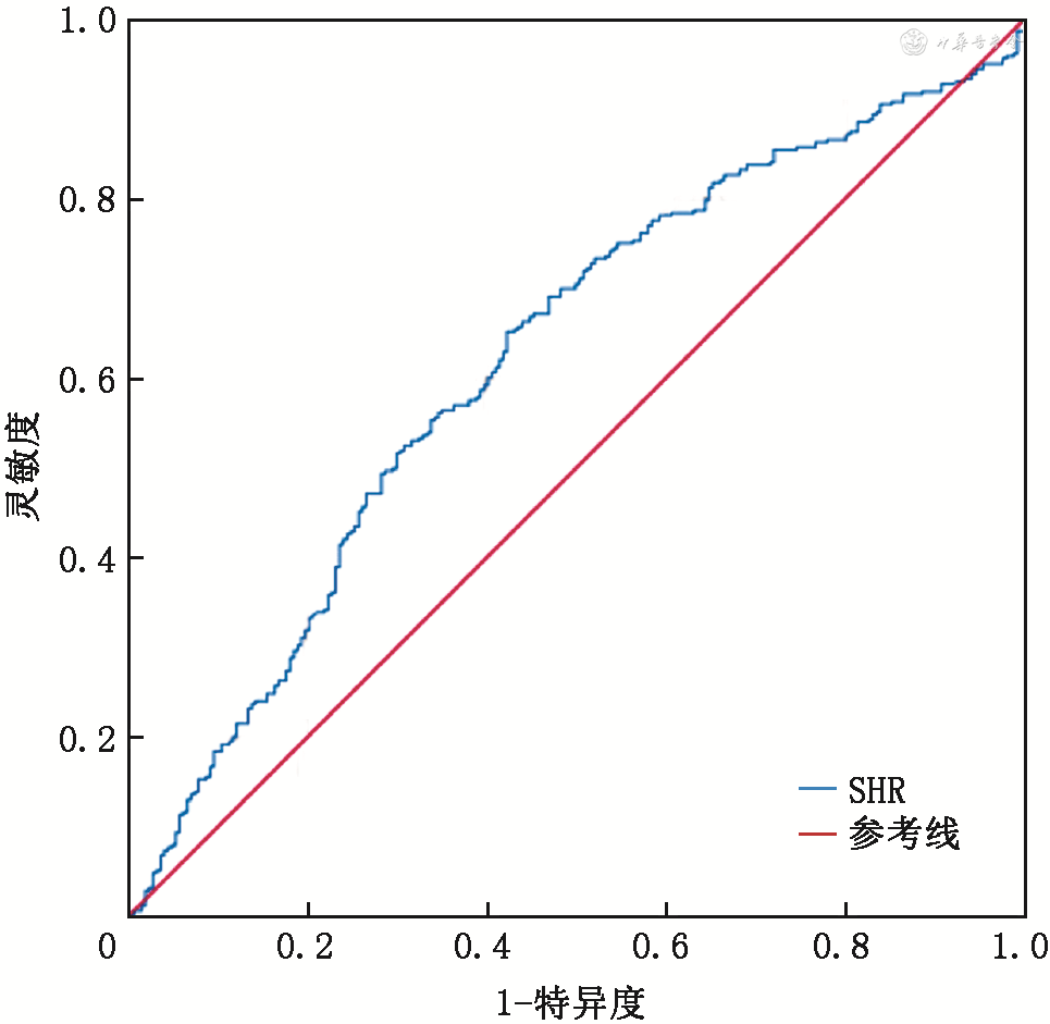 SHR预测急性大动脉闭塞性缺血性卒中患者接受血管内治疗后出现不良神经功能预后的ROC曲线显示,AUC为0.621(95%CI:0.575~0.667,P<0.001),截断值(cut off值)为1.20(图1)。当SHR≥1.20时,其预测3个月不良神经功能预后的灵敏度为65.2%(232/356),特异度为57.6%(136/236)。