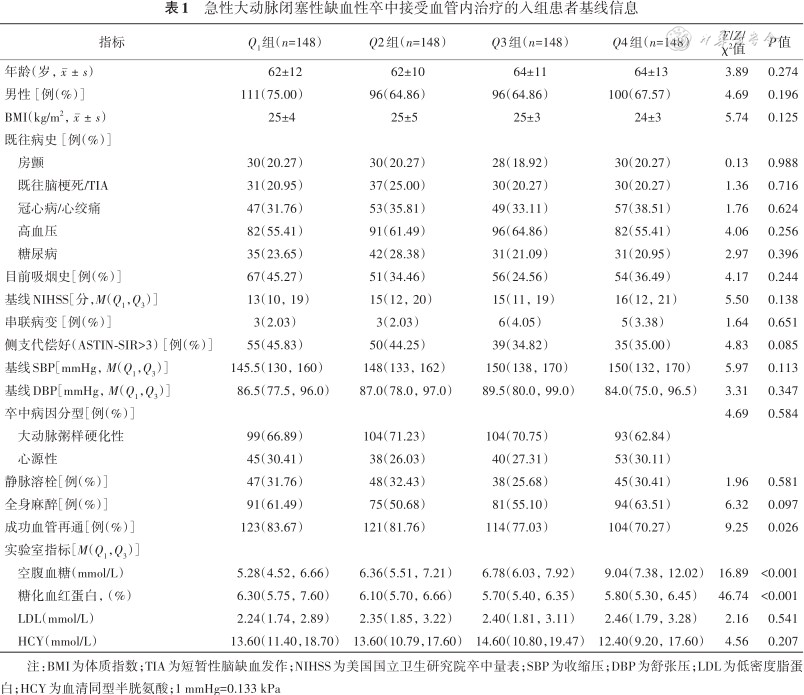 | 指标 | Q1组(n=148) | Q2组(n=148) | Q3组(n=148) | Q4组(n=148) | F/Z/ χ²值 | P值 |