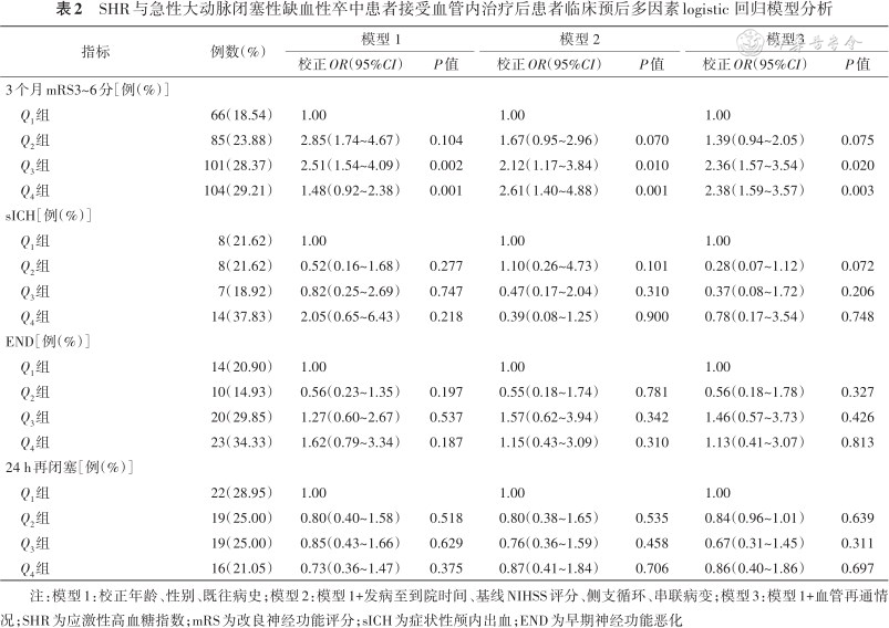 入组患者来源于急危重缺血性卒中血管再通治疗监测与管理的队列研究(RESCUE-RE)数据库。筛选2018年7月至2019年5月、发病24 h内、影像学证实为急性大动脉闭塞性缺血性卒中、且接受血管内治疗的患者。SHR通过入院时血糖水平与预估的平均血糖的比值计算得来。依据SHR四分位数,将患者分为4组(分别是Q1组、Q2组、Q3组、Q4组)进行后续分析。主要结局为发病3个月神经功能不良预后[定义为改良Rankin量表(mRS)3~6分]。次要结局包括早期神经功能恶化(END)、发病后3个月内死亡、症状性颅内出血。采用多因素logistic回归模型和多因素Cox比例风险模型评估SHR与患者临床预后指标的关联。