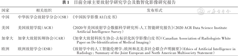| 美国 | 美国放射学院(ACR) | 《2020年美国放射学会数据科学研究所-人工智能研究报告》(2020 ACR Data Science Institute Artificial Intelligence Survey) |