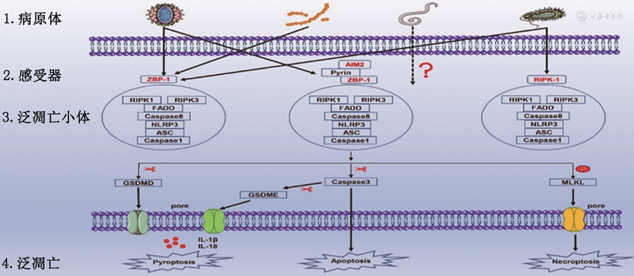 作为当下最复杂、且与多种人类疾病密切相关的程序性死亡方式,泛凋亡具有良好的研究前景,但同时也有很多亟待解决的问题。例如,病毒、细菌和真菌感染均可通过ZBP1感受器启动泛凋亡的发生,但它们之间具有什么样的联系和区别?寄生虫感染也可以触发泛凋亡,但其具体的感受器和分子通路是什么?病原体和肿瘤细胞想方设法逃脱泛凋亡以避免自身被清除,但这些病原体和肿瘤细胞通过什么分子机制来实现泛凋亡逃逸过程?除了文中已知的3种泛凋亡小体,是否还存在其他未发现的蛋白或分子可以介导泛凋亡小体的组装?作为3种程序性死亡的共有上游通路,干预泛凋亡能否发挥出预期临床效果?尽管泛凋亡还存在诸多疑问,但此概念的提出和相关研究进展无疑为研究人员开辟了一片全新的领域,早日阐明泛凋亡在人类疾病中的作用和调控机制,或许能够探索出一条新的治疗策略,为相关患者的治疗带来突破。