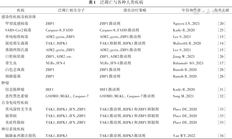 泛凋亡小体的组装以及泛凋亡的激活是机体有效防御外来病毒、细菌和真菌感染的一种自身保护性反应[17, 18]。泛凋亡概念的提出强调了分子精准化干预在疾病治疗学中的重要性,随着细胞PCD途径之间的界限变得越来越模糊,单一性地阻断或者干扰某一种死亡方式可能不会带来预期的治疗效果。目前阻断炎症细胞死亡的方法包括靶向传感器分子(如NLRP3),抑制酶促靶点(如RIPK1),以及中和下游细胞因子信号(如IL-1信号)等,然而这些抑制剂是特异性针对焦亡、凋亡和坏死性凋亡设计的,临床治疗效果并不理想。通过靶向干预泛凋亡上游信号传导通路、感受器或支架分子可以有效地阻断泛凋亡所属3种死亡方式的启动,这无疑为人类相关疾病的治疗带来新的选择[19](表1)。