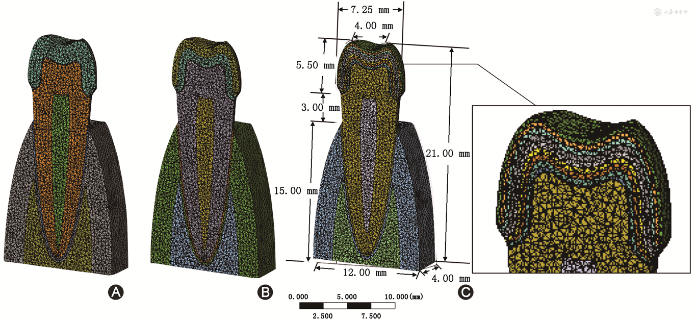 根据标准解剖尺寸构建下颌第一前磨牙的轴对称三维有限元模型[7]。使用三维建模软件Solidworks Premium 2013 SP 4.0(美国Dassault Systèmes SolidWorks公司)进行建模,牙体预备体形态根据以下参数设置构建:咬合面降低2.0 mm,轴面聚合度为4°,肩台位于牙槽嵴嵴上方3.0 mm处,宽1.0 mm。随后复制牙体预备体外部轮廓并用于模拟厚度为0.1 mm的水门汀黏接层[8],同理,复制水门汀黏接层的外表面并用于模拟全冠内表面,以使全冠修复体、水门汀黏接层及牙体预备体的各个接触面相吻合,从而减少其对数学分析过程中的干扰。根据标准解剖尺寸对牙齿周围的牙槽骨进行建模[9],牙周膜的厚度为0.2 mm。全冠修复体则由3种不同的结构构成,模型A、B和C分别为单层、双层和8层结构全冠修复体(图1)。