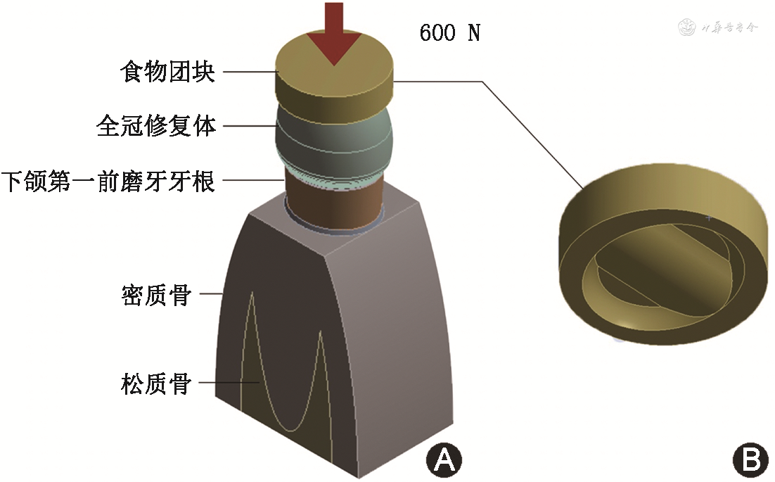 为了更准确地模拟全冠修复体在口内的服役情况,考虑到咀嚼周期闭合阶段食物团块与牙冠表面之间的接触,在全冠咬合面放置食物团块模型,并在其表面平行牙长轴施加600 N的载荷(图2)[12]。在系统中设定模型的所有界面紧密接触且稳固黏接,底部固定,以确保仅限制Z轴上的移动,以便计算其他方向上产生的形变。加载后输出模型A、B、C、D、E的应力分布结果,计算全冠修复体的拉应力峰值及水门汀黏接层的剪切应力峰值,而模型F及G的应力分布结果待GA进一步优化后输出。