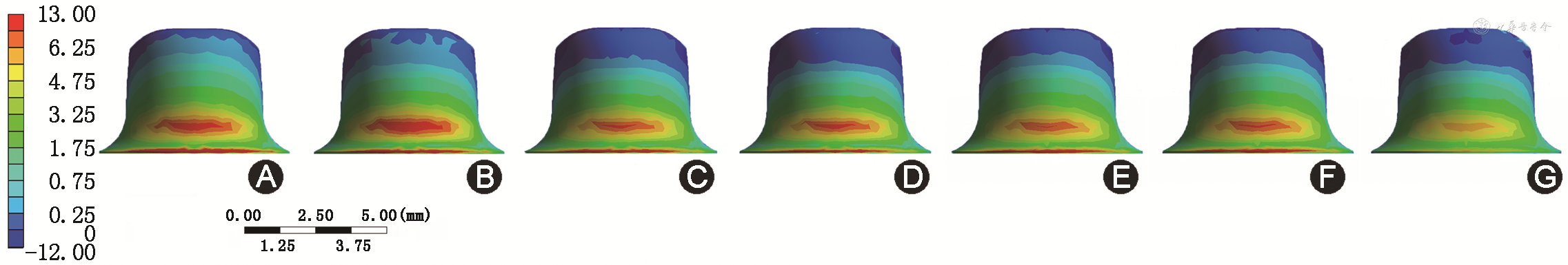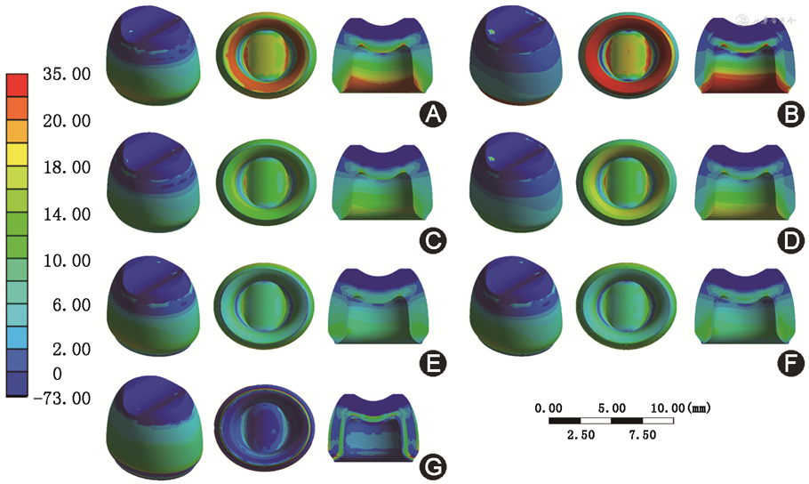 注:A为氧化锆全冠;B为二硅酸锂玻璃陶瓷全冠;C为氧化锆-饰瓷全冠;D为二硅酸锂玻璃陶瓷-饰瓷全冠;E为仿人牙釉质8层结构全冠;F为以降低全冠拉应力峰值为优化目标的8层结构全冠;G为以降低水门汀黏接层剪切力峰值为优化目标的8层结构全冠