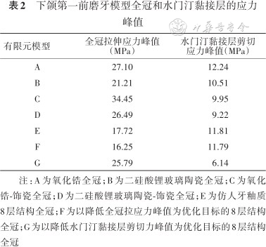 全冠修复体的有限元应力分布图显示,全冠修复体的主要拉伸应力集中在全冠颈部边缘及组织面(图3)。各种模型的拉伸应力峰值如表2所示,其中单层、双层结构全冠(A、B、C、D)及以人牙釉质弹性模量为基准并以降低水门汀黏接层剪切力峰值为优化目标的模型G的拉应力峰值范围为21.21~34.45 MPa,而仿人牙釉质8层结构全冠(E)的拉应力峰值为17.72 MPa,较二硅酸锂玻璃陶瓷全冠(D)低16.46%;以人牙釉质弹性模量为基准并以降低全冠拉应力峰值为优化目标的模型F的拉应力峰值降低至16.25 MPa,分别较模型E和二硅酸锂玻璃陶瓷全冠(B)降低8.31%和23.40%。