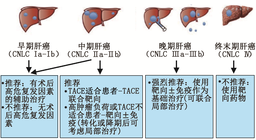 对于早期HCC[中国肝癌分期方案(China liver cancer staging,CNLC)Ⅰa~Ⅰb]患者,手术是主要的治疗手段,合并高危复发因素者,推荐靶向药物作为辅助治疗;针对中期HCC(CNLC Ⅱa~Ⅱb)患者,国内指南推荐以手术或者介入治疗为主,对于合并术后高危复发因素的患者可加用靶向药物作为辅助治疗;而对于晚期HCC(CNLC Ⅲa~Ⅲb)患者,国内指南推荐以系统性治疗为主。近年来,由于药物客观有效率不断提高,初始不可切除患者有望通过药物治疗达到肿瘤明显缩小、癌栓降期的治疗效果,从而获得根治性治疗机会。在肝功能较差患者中靶向药物应用也积累了一定的使用经验,可供临床参考。