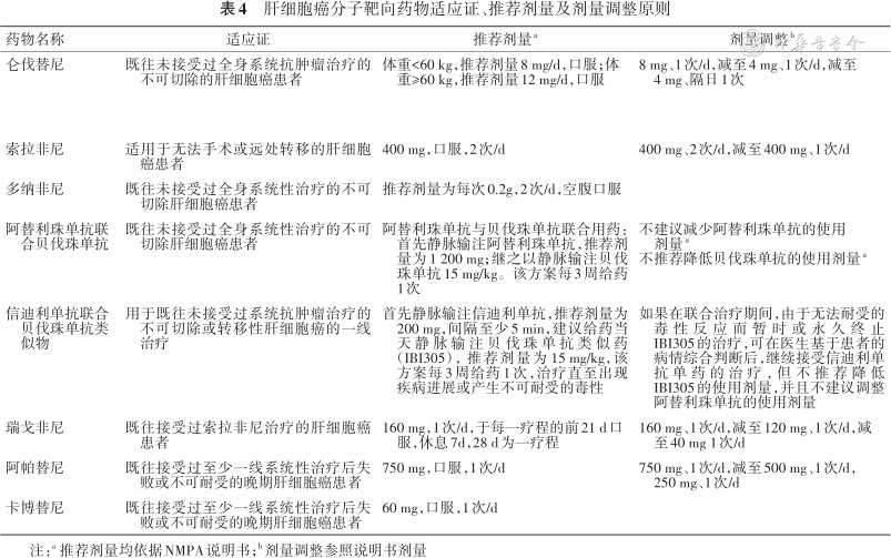 肝细胞癌分子靶向药物适应证、推荐剂量及剂量调整原则