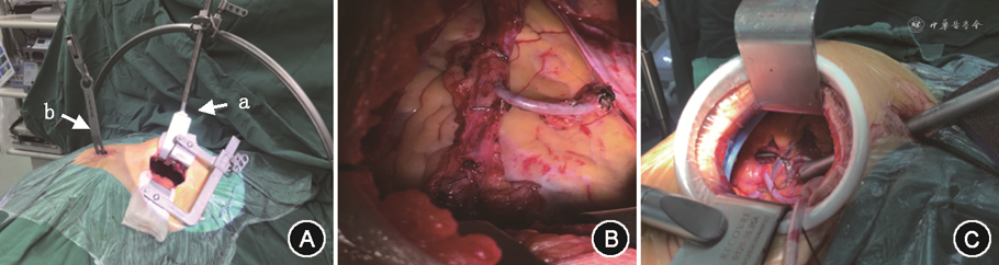 传统组行传统开胸手术治疗。微创组MICS CABG手术方法:行气管插管全身麻醉,患者取仰卧位,将其左胸垫高30°。连接体外自动除颤仪。以左胸前外侧第5肋间心尖所在位置为切口中点进胸,于胸腔置入悬吊式乳内动脉牵开系统(图1A)并向左上牵引胸壁进而获得清晰的手术视野。先游离右侧乳内动脉:分离前纵隔,将右侧胸膜打开,保持左肺单肺通气,调整Rultract牵引装置及体位,从乳内动脉中段无脂肪肌肉覆盖区应用电刀(30J),上至第1肋下至第5或6肋乳内血管分叉处小心游离右侧乳内动脉,游离结束后转换成右肺单肺通气。然后对左乳内动脉进行游离。两侧乳内动脉游离完成后,行双乳内动脉原位搭桥,在右侧乳内动脉根部离断血管后端,侧吻合于左乳内动脉中部,成“Y”形复合血管桥(图1B)。完成左乳内动脉-左前降支血管搭桥后(图1C),非左前降支血管,应用链式主动脉侧壁钳临时钳夹升主动脉,应用腔镜直视下吻合大隐静脉-主动脉近端,用左乳内动脉作为移植血管与左前降支吻合,大隐静脉作为移植血管分别与回旋支、具体钝缘支、右冠状动脉、后降支吻合,吻合方法与常规CABG相同,完成多支搭桥手术,常规放置冠状动脉分流栓以避免冠状动脉缺血诱发心室颤动或严重血流动力学紊乱,所有操作均在心脏不停跳体外循环下完成。