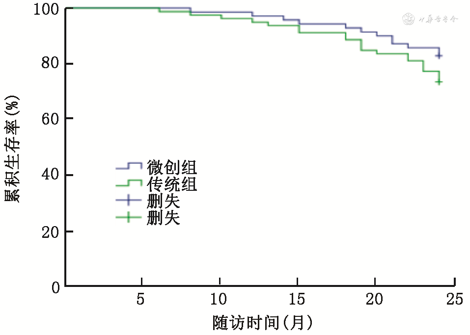 以患者是否发生MACE事件作为观察终点,根据微创组与传统组患者2年随访结局绘制生存曲线,结果显示,微创组与传统组患者累积无MACE发生率分别为17.39%和26.92%(χ2=1.87,P=0.171)。详见图2。