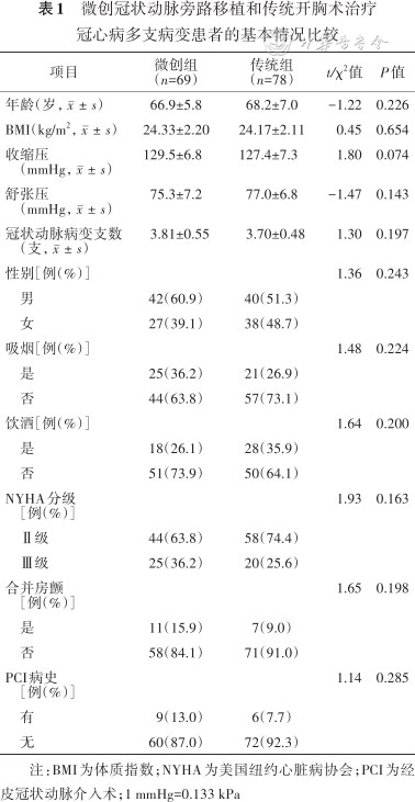 微创冠状动脉旁路移植和传统开胸术治疗冠心病多支病变患者的基本情况比较