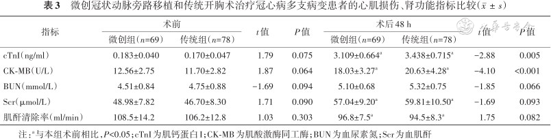 微创冠状动脉旁路移植和传统开胸术治疗冠心病多支病变患者的心肌损伤、肾功能指标比较()