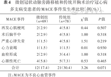 | MACE事件 | 微创组 (n=69) | 传统组 (n=78) | χ2值 | P值 |