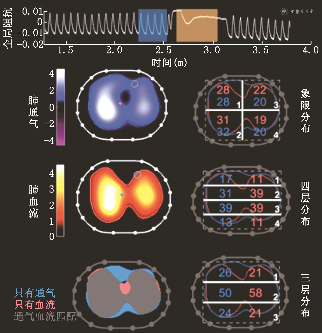 记录的EIT肺血流数据,通过软件分析,可以得到肺通气分布图像、肺血流分布图像以及匹配图像,在这3个图像上分析得出各兴趣区的占比,以及匹配区域、死腔区域和分流区域占比等指标(图1)。