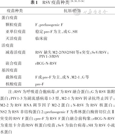 注:RSV为呼吸道合胞病毒;F为RSV融合蛋白;G为RSV黏附蛋白;PIV1-3为副流感病毒1-3型,M2-1为RSV转录抗终止因子;M2-2为RSV RNA调节因子M2-2蛋白;N-RSV为RSV 核蛋白;NS2为RSV非结构蛋白2;prefusogenic F为弗林蛋白酶剪切位点Ⅱ突变的RSV F蛋白;pre-F为RSV F蛋白融合前构象;rBCG-N-RSV为重组卡介苗/RSV核蛋白疫苗;SeV为仙台病毒;SH为RSV小疏水蛋白