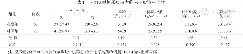 2. 对象:本研究为随机对照试验,获得山东第一医科大学附属人民医院伦理委员会批准(201712011),所有患者均签署知情同意书。选取2018年1月至2021年1月山东第一医科大学附属人民医院T2DM患者140例,其中男80例,女60例,年龄41~72(55±5)岁。纳入标准:(1)T2DM诊断符合《中国2型糖尿病防治指南(2017年版)》的标准[5];(2)无动脉粥样硬化性心血管疾病;(3)年龄>18岁;(4)具有心血管危险因素,例如吸烟、超重、早发心血管病家族史等;(5)血脂异常,无调脂治疗史;(6)患者及家属知情同意。排除标准:(1)其他类型糖尿病;(2)合并恶性肿瘤、肝肾功能异常、甲状腺功能异常等其他严重疾病。采用随机数字表法将患者分为2组:(1)观察组(n=68):给予PCSK9抑制剂调脂;(2)对照组(n=72):给予他汀类药物调脂。