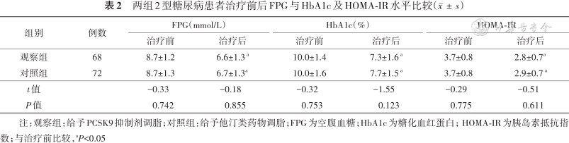 注:观察组:给予PCSK9抑制剂调脂;对照组:给予他汀类药物调脂;FPG为空腹血糖;HbA1c为糖化血红蛋白;HOMA-IR为胰岛素抵抗指数;与治疗前比较,aP<0.05