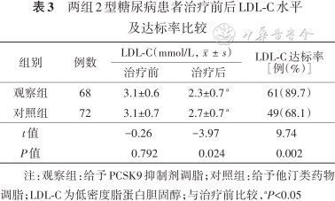 两组2型糖尿病患者治疗前后LDL-C水平及达标率比较