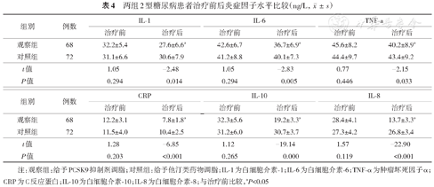 综上所述,相比较他汀类药物,PCSK9抑制剂在T2DM患者中调脂作用较好,同时可改善炎症水平。本研究不足之处在于所选取研究对象为T2DM患者,并未对不同病程、是否合并糖尿病并发症的患者进行分级比较,今后将积累大样本研究进行细化研究,明确PCSK9抑制剂对不同糖尿病病情及并发症的影响。