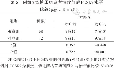 观察组治疗后PCSK9水平较治疗前降低(P<0.05);对照组治疗前后PCSK9比较差异无统计学意义(P>0.05);观察组治疗后PCSK9明显低于对照组(P<0.05)。结果见表5。