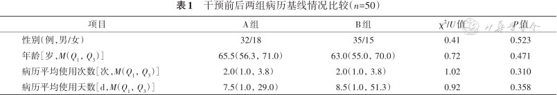将纳入研究的100份门诊病历以综合干预时间为节点,干预前为A组,干预后为B组。两组患者性别、年龄差异均无统计学意义(均P>0.05)。A组50份病历共使用150例次,B组50份病历共使用156例次,平均使用天数及次数间差异均无统计意义(均P>0.05),结果见表1。