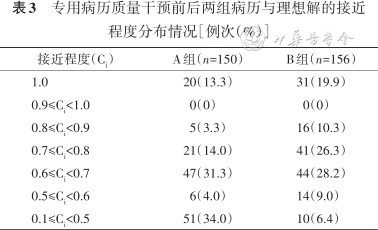 专用病历质量干预前后两组病历与理想解的接近程度分布情况[例次(%)]