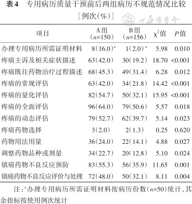 回顾性调查南京医科大学附属淮安第一医院2020年6月归档的50份门诊癌痛专用病历(150例次记录)书写质量。根据评价结果实施干预,并对干预后2021年10月归档的50份癌痛专用病历(156例次记录)书写质量进行同法再评价。