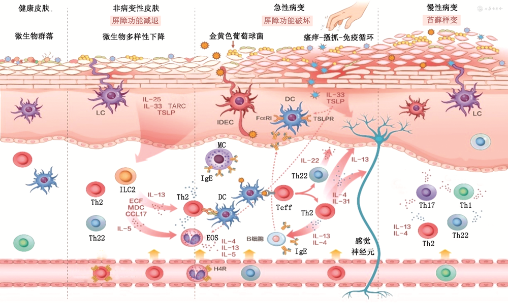 注:LC为朗格汉斯细胞(专职皮肤抗原提呈细胞);IDEC为炎症性树突状表皮细胞;Teff为效应T细胞;H4R为组胺H4受体;ECF为嗜酸性粒细胞(EOS)趋化因子;MDC为巨噬细胞来源趋化因子;TARC为胸腺活化调节趋化因子;IL为白细胞介素;DC为树突细胞;Th为辅助性T细胞;MC为单核细胞
