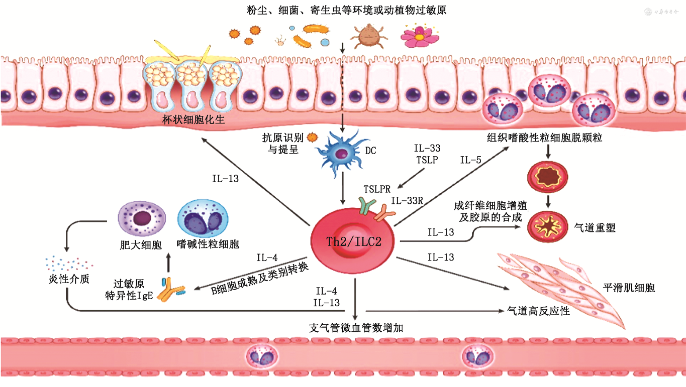 注:IL为白细胞介素;ILC2为2型天然淋巴细胞;TSLPR为胸腺基质淋巴细胞生成素受体;DC为树突细胞;Th为辅助性T细胞