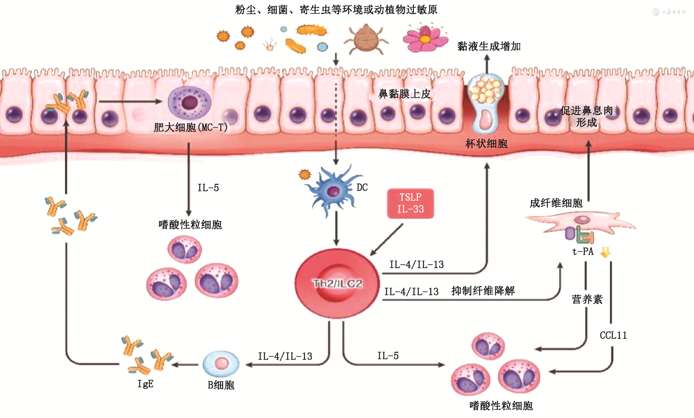推荐意见2∶2型炎症的免疫学机制简单概括如下:以机体所暴露在不同环境或动植物过敏原为触发点,通过DC等抗原提呈细胞,使初始T细胞分化为Th2细胞并分泌2型细胞因子;或通过促进上皮细胞分泌预警素,活化ILC2细胞产生2型细胞因子。这些细胞因子可激活相关免疫细胞分泌炎性介质及趋化因子,最终形成2型炎症反应。