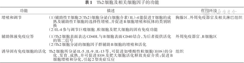 | 增殖和调节 | (1)辅助性T细胞2(Th2)细胞分泌白细胞介素(IL)-4能促进T细胞的成熟及辅助性T细胞的选择性增殖,并促进B细胞增殖和抗体的类别转换 (2)IL-4参与调节巨噬细胞、粒细胞及肥大细胞的固有免疫功能 | 胸腺区、外周免疫器官及相关淋巴组织 |
