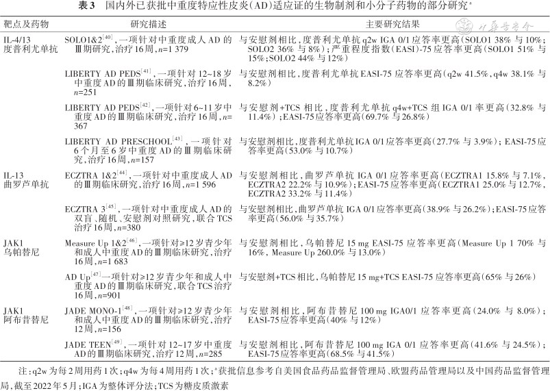 国内外已获批中重度特应性皮炎(AD)适应证的生物制剂和小分子药物的部分研究a