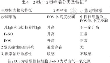 既往对哮喘的类别划分或从达到哮喘控制所采用的治疗级别入手,分为轻-中-重度哮喘;或根据疾病的发展和转归分为急性发作期-慢性持续期-临床控制期[59]。随着认识的深入,2型炎症和哮喘发生发展表现出密切关联。自2019年开始GINA指南便以2型炎症对哮喘发病进行分类(表4)[60],分为2型/非2型哮喘。研究结果表明,轻度及中度哮喘患者中有50%~70%是2型免疫反应异常引起的[61, 62],而一项关于用IL-13刺激支气管上皮基因表达的研究中发现2型哮喘炎症患者占比约50%[63]。另外一项中国单中心住院后缓解期的重度哮喘患者的研究发现有38.5%的患者是以EOS为主要气道炎症类型[64],但在C-Biopred研究中发现EOS表型占78.6%,较国外研究队列更高[58]。
