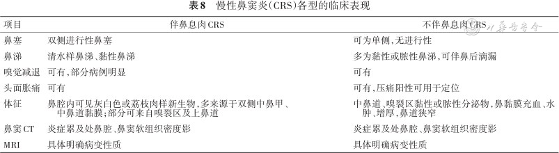 AFRS在症状上与CRS相似,均以鼻塞、流涕、头面部胀痛、嗅觉减退等为主要表现,体征上也多数类似CRS,部分患者表现为鼻窦肿物,可压迫眶侧或颌面部至隆起,严重时可能出现眼球突出。鼻窦CT除可见软组织密度影外,可能出现真菌团块的高亮影。