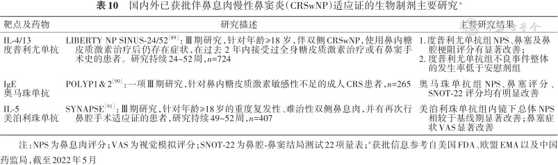 IL-4/13 度普利尤单抗 | LIBERTY NP SINUS-24/52[89]:Ⅲ期研究,针对年龄≥18 岁,伴双侧CRSwNP,使用鼻内糖皮质激素治疗后仍存在症状,在过去 2 年内接受过全身糖皮质激素治疗或有鼻窦手术史的患者。研究持续24~52周,n=724 | 1.度普利尤单抗组NPS、鼻塞及鼻腔梗阻评分有显著改善; 2. 度普利尤单抗组不良事件整体的发生率低于安慰剂组 |